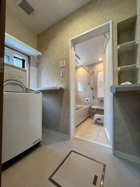 汚れやカビの落としにくさにお悩みだったお客様へ、清掃性と快適性に優れた「グランスパ」をご提案しました。あわせて脱衣室の内装も一新し、浴室と調和するベージュ系のアクセントクロスを採用。全体に統一感が生まれ、清潔感と落ち着きのある空間に仕上がりました。また、洗濯機の排水位置をずらすことで棚を設置するスペースを確保し、収納力が格段に上がりました。