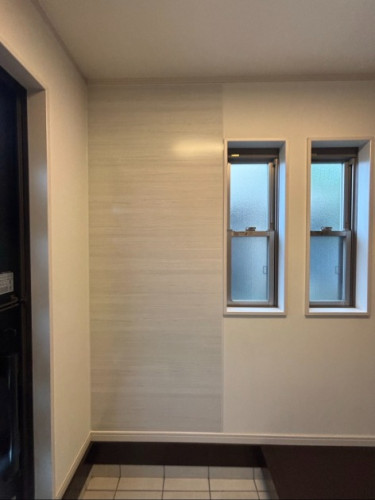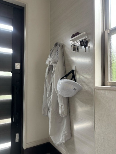 子供が中学に上がり、自転車通学になる事で、エマウォールを玄関に付けたら雨の日もカッパとヘルメットを干せる!と思い付きました。