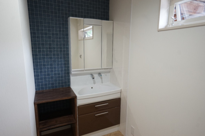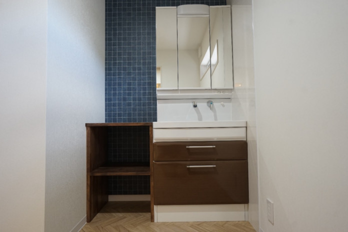 洗面化粧台、タイル風のクロス、色にこだわった棚、うまくまとまりおしゃれな空間に生まれ変わりました。