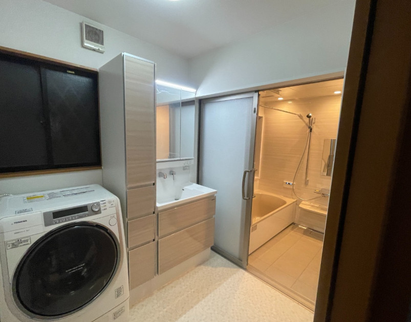 最新のユニットバスへリフォーム。洗面化粧台は収納力UPへ