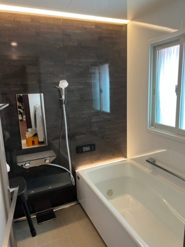 肌触り抜群の鋳物ホーロー浴槽と肩包み湯で肩までしっかり温まり、より贅沢な入浴タイムを楽しめる浴室に生まれ変わりました。掃除も簡単で、ストレートライン照明やサーモスタット水栓、浴室側のラグジュアリーライトが映えるスタイリッシュなデザインも魅力です。清潔感と高級感を兼ね備え、毎日の入浴が楽しみになる快適な空間に仕上がりました。