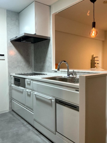 「エーデル」で刷新された気品漂うキッチンへ進化しました。お手入れも簡単になり、収納も充実。明るく開放的な空間を実現しました。床・キッチンパネルも同系色でまとめることで、よりおしゃれな空間へ。