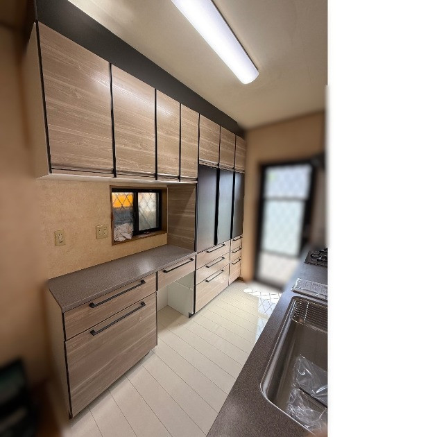 既存のキッチンがふるさを感じるようになったため、デザイン性の高い「トレーシア」に一新。お揃いのカップボードも設置し、収納力が大幅に向上しました。床も全面的に張り替え、キッチン全体が統一感のある空間に。キッチンパネルもホーロー素材でお手入れも簡単になり、日々の家事がぐっと楽に!
