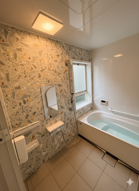 デザイン性と清掃性を両立。印象的なアクセントパネルに合わせ、照明も暖色系でコーディネートし、温かみと高級感のある空間を演出しました。壁は汚れに強いホーロー、鏡や収納はマグネット式で掃除が簡単な「家事らく」仕様。滑りにくいタイル床や手すりで「バリアフリー」にも配慮し、ご夫婦が安心して使える浴室が完成しました。