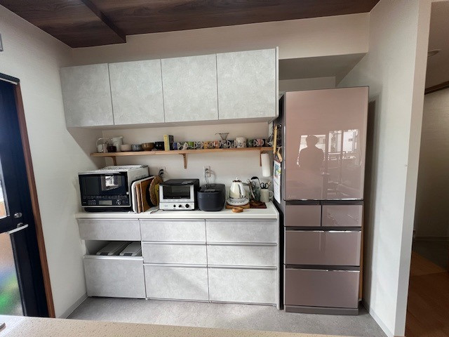 少し高さが低い物へしました。立体感がでましてデザイン的には良いと思います。冷蔵庫とも奥行を揃えてすっきりと。お気に入りのマグカップを置くための棚板を棟梁に制作してもらい取り付けています。