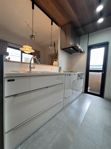 磁石タイプのキッチンパネルやデザインパネル(セレント)をダイニング側へ採用してます。キッチンと洗面部分の床はグレー系のフロアータイルへし、デザイン性の向上や耐久性も向上しました。