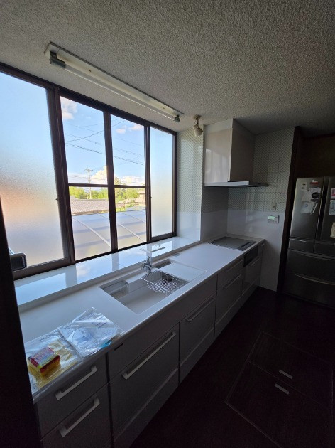 大きな窓を活かし、陽の光と調和するようキッチンは落ち着いたカラーにしました。 お客様が既存のタイルを気に入っておられたので、汚れやすい高さの範囲のみパネルを貼り、お掃除もし易くなりました。