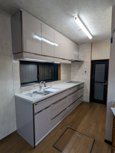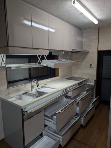 奥様の憧れのキッチン、タカラのレミューをご採用。 引き出しの中にインナー引き出しを採用、吊り戸下にアイラックをご採用され、収納力がぐっと上がり、非常に快適なキッチンとなりました。