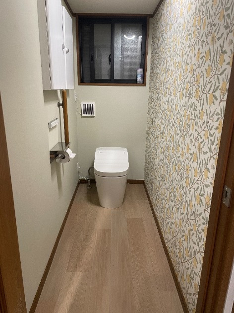 仕上げにはアクセントクロス(サンゲツ ウイリアム・モリス)を取り入れ、華やかで心地よいトイレ空間に生まれ変わりました。