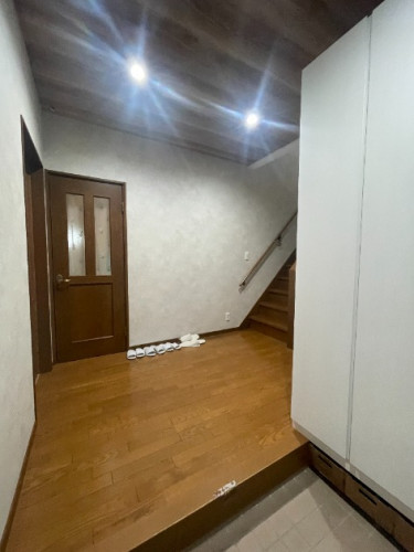 さらに、奥様のこだわりポイントとして、天井には温かみのある木目柄のクロスを採用し、玄関全体がやさしい雰囲気に仕上がりました。