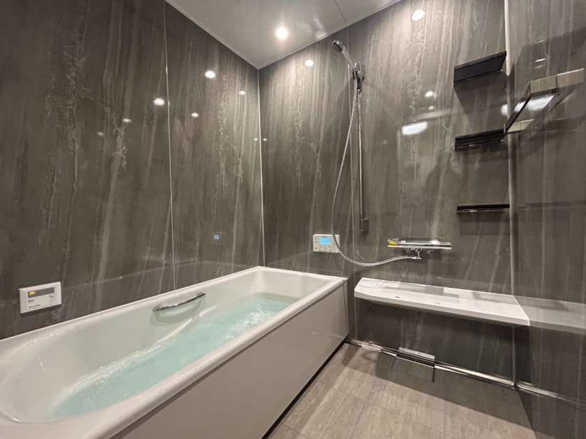 まるで高級ホテルのようなバスルームです。全体のカラーもダークにし、より高級感が漂います。