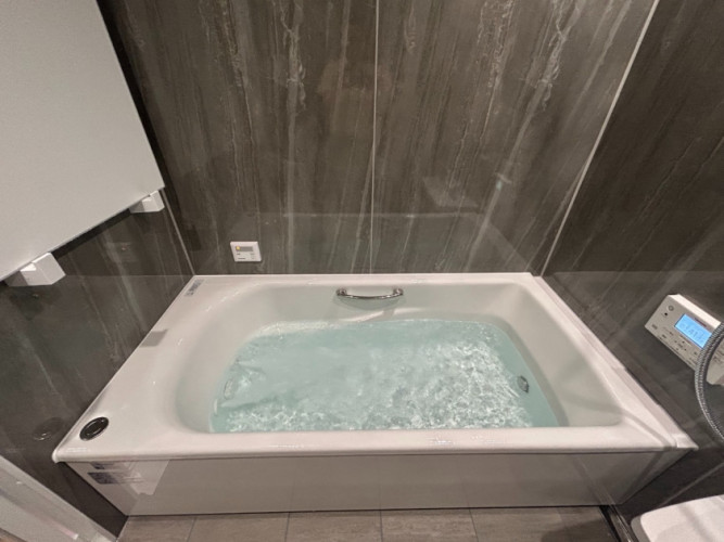 鋳物ホーロー浴槽はなめらかで温かいです。ヘルシージェットを使うと体がほぐれ、一日の疲れが癒されます。