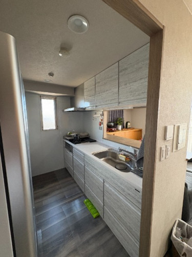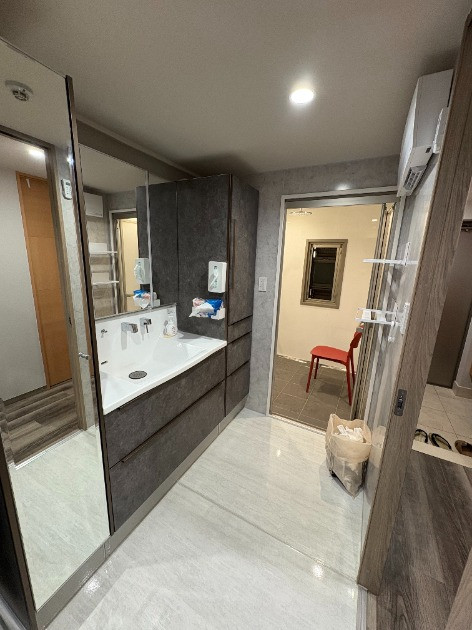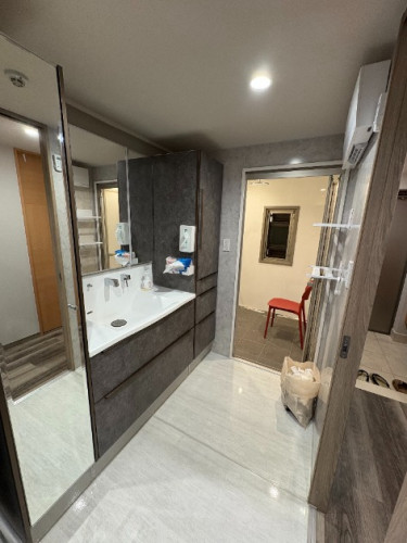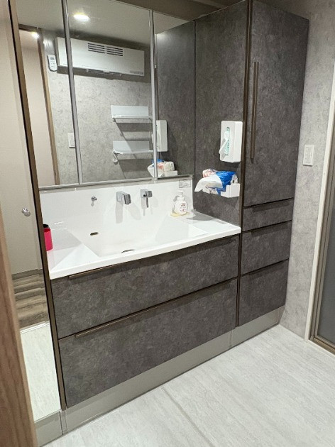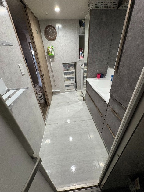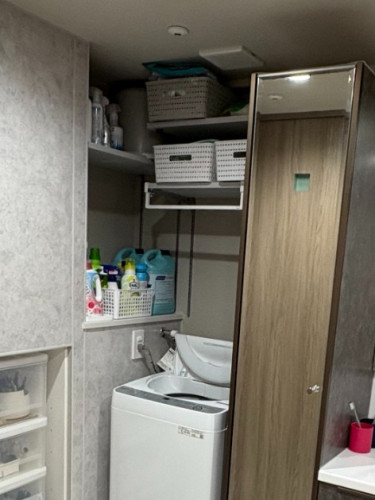 収納棚の扉を、姿見鏡として使用できるような鏡にしました。UBを小さくし、脱衣洗面室を大きくする間取り変更をしております。