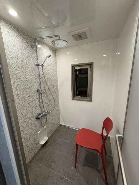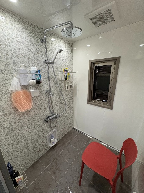 浴槽なしのシャワーのみにしました。浴室の広さを従来より小さくし、脱衣洗面スペースを広くしました。天井据付の大きなオーバーシャワーヘッドが本当に心地いいそうです。