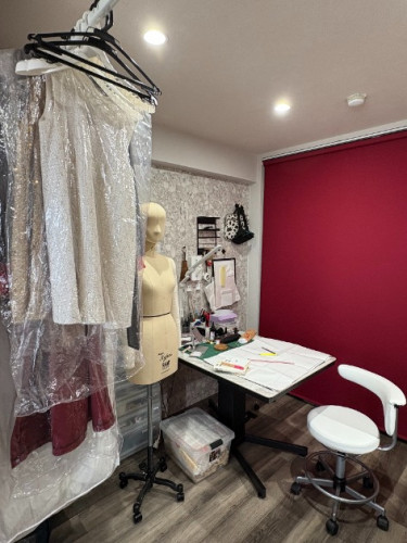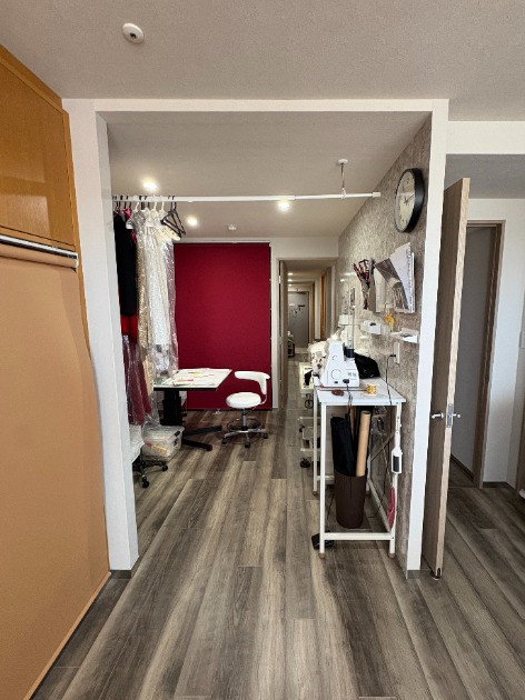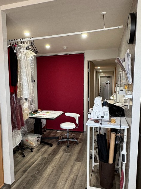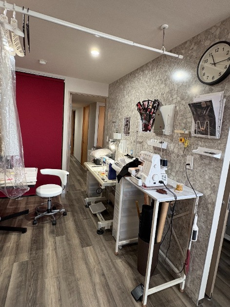 和室をフローリングにし、壁を全面にエマウォールを設置。娘様が作成したお洋服を吊り下げられるよう、室内物干しを設置。マグネットでハンガーも自在に移動設置が出来、お仕事がはかどります。