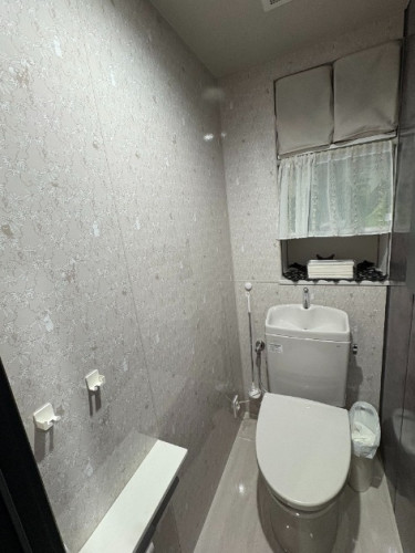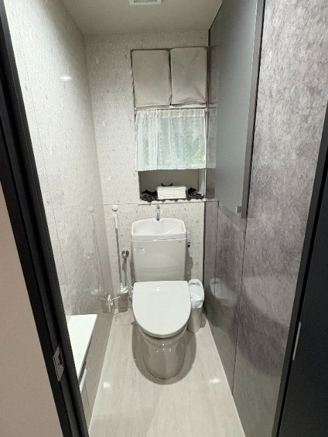 掃除が簡単にできるように、壁・床すべてタカラスタンダードのエマウォールを使用しました。向かって右側の壁に防災グッズを常備できるように収納スペースを造作しました。