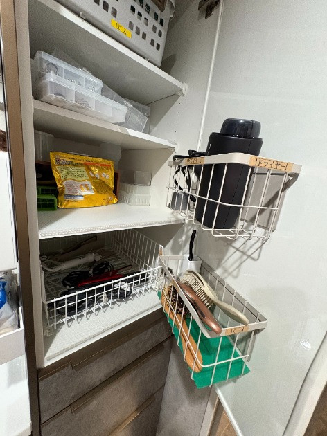 収納棚の扉がホーローなので、扉裏もマグネット収納を活用されています。使用した後のドライヤー等もすぐに収納できるので、置きっぱなしにならず、都度収納できると好評です。