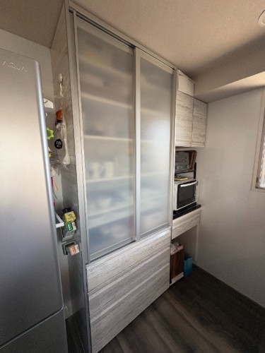 購入当時からのキッチンは、開き戸で使いづらく引出収納にしたいとのご要望。お料理好きの奥様は、素敵な食器も多く、全て簡単に取り出せるようにしたいとおしゃっていました。キッチン入口の壁開口部も広くすることによって動線も良くなり、家事も楽しく結果として楽になったそうです。