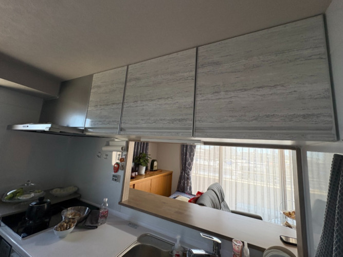 天井までの収納を設置する事によって、すっきりしました。よく使うラップ類はすぐに取り出せるように、収納棚のホーロー壁を利用してマグネット収納にされました。