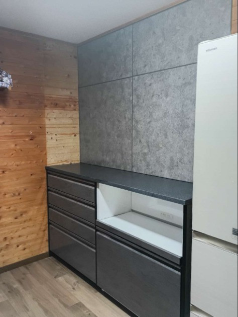 壁のパネルもグレーの同色でまとめたキッチン。床はリビングと異なるカラーにしています。