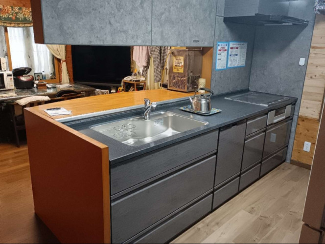 落ち着いたグレー色のキッチンで、すっきりと見せたいとのご要望がありました。キッチンはIHまでがフラットになっており、作業スペースも以前より広くなり使い勝手がよくなりました。