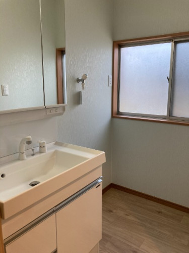 トイレの入口が脱衣室側にあり、洗面化粧台と洗濯機が向かい合わせで使い勝手が悪かった。 トイレ入口を廊下側に移動し洗面台を設置するスペースを確保しました。