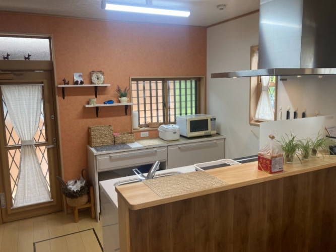 改修前はⅮKが独立して、暗く、使い勝手が良くありませんでした。 今回、リビングとの間にあった両面ハッチと壁、柱を撤去して一体 とし、明るく、見晴らしの良い対面式キッチンに改修させて頂きました。 また、造付食器棚も新たにタカラ製にしてトータルコディネートし収納力もアップいたしました。 キッチンの寸法はこれからの生活に必要十分なコンパクトサイズなものを選んでいただきました。 また、背面カウンターに木製の棚を設置してカフェキッチンのような空間となりました。