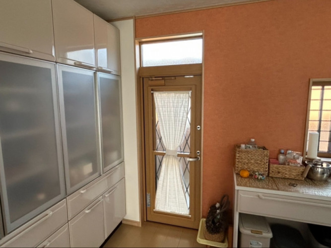 エアパスタイプの勝手口にする事で明るさと風通しもえられました。 また、キッチンと同じ素材の食器棚を設置してトータルコーディネート。 収納力も十分すぎるほどの容量です。