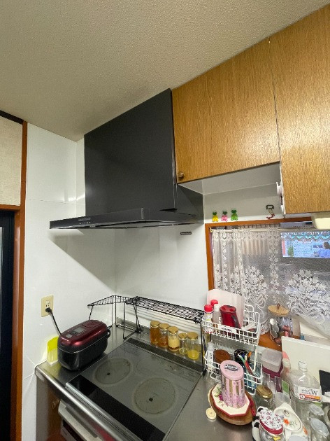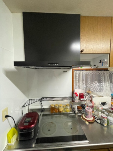 既存のフードがタイルに埋まっていたため、幅90㎝がつかず、幅75㎝を設置しました。隙間は壁を作りキッチンパネルできれいに仕上げました。