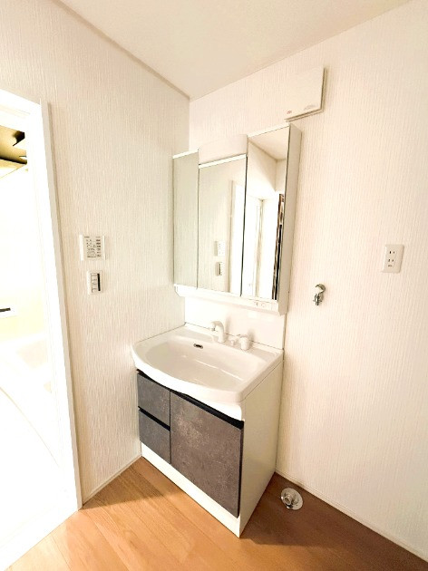 採用したのは、ミラーの裏にたっぷり収納できる三面鏡タイプで、歯ブラシや化粧品などの小物類をすっきり整理でき、見た目も美しい空間に仕上がります。