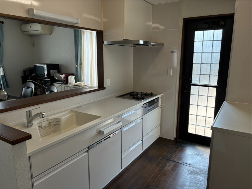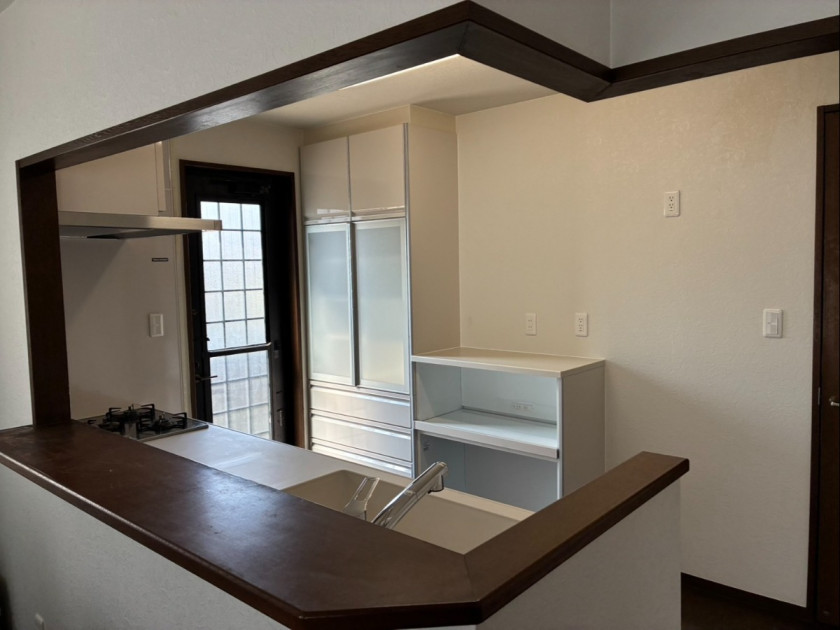 吊戸を無くし家電収納等を背面収納に統一することで、見た目も使い勝手もスッキリ!家電の配線がごちゃごちゃすることもなくなり、ストレスなく使用していただけるように仕上げました。元々の吊戸がある所にはホーローキッチンパネルを貼ることにより、見た目の統一感、清掃性を向上しました。