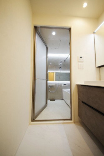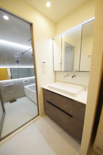 やわらかな光がふんわりと広がる洗面スペースに。限られた空間でも、照明の工夫で気持ちまで明るくなるような身支度時間を演出します。