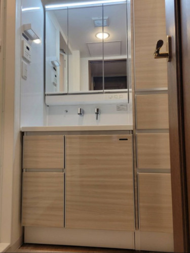 浴室とテイストをそろえベージュ系で落ち着きのある雰囲気に統一し、毎日の身支度も気持ちよく♪