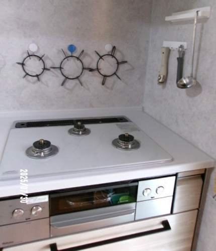 ホーローのキッチンパネルも使い勝手が良くコンロをお掃除した後、マグネットに五徳をぶら下げて乾かしています。