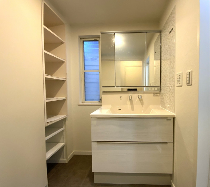 今回のリフォームでは、収納力の高い三面鏡タイプを採用。鏡の裏にもたっぷりと収納できる設計に変更し、日常使いの小物をすっきり整理できるようになりました。