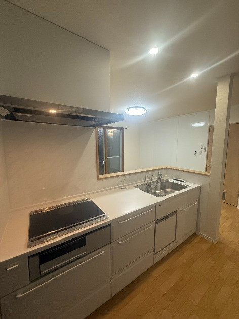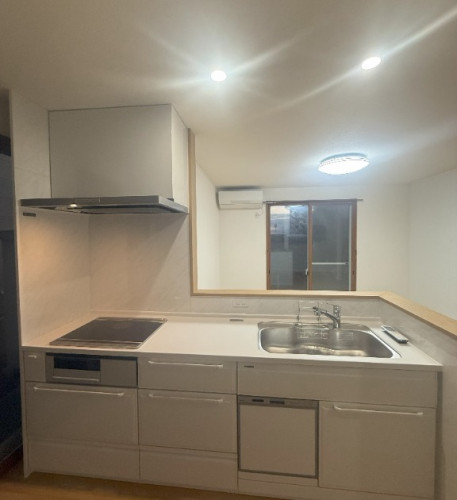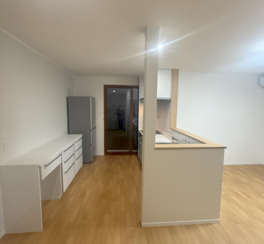 元のキッチン部は収納スペースとして活用され、キッチン背面にはタカラのカウンターが設置されており、収納力と使い勝手が向上しています。