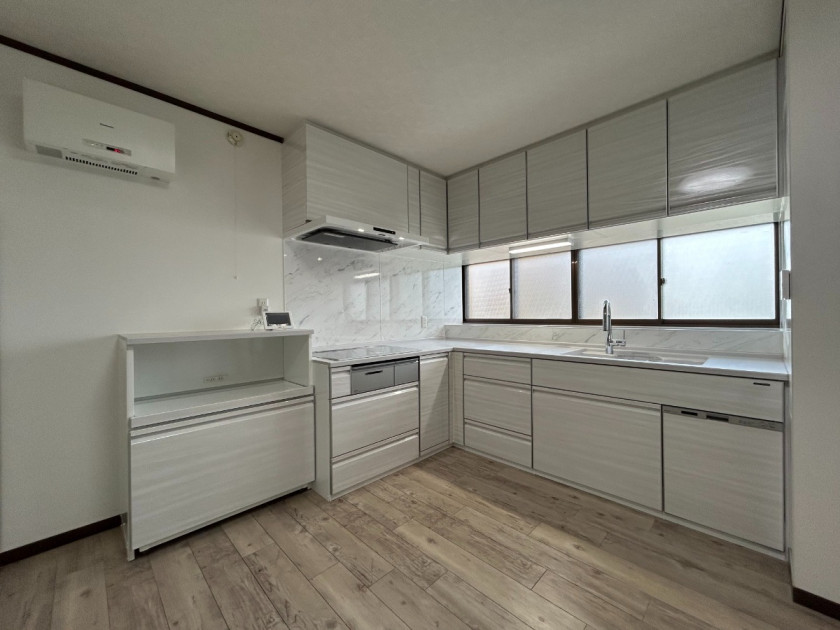 流行りの対面キッチンなどではございませんが、もとよりL型キッチンの使い勝手の良さから、今回も同じL型で入れ替えていただきました。色々商品を見る中でホーローのお掃除性と清潔感は商品の決め手となりました。ホワイトグレー系のキッチンを選びましたので、床の色もグレージュ系の木目をご提案頂き、空間としてとても気に入っています。これまでと同じL型とはいえ、下台の引き出しの収納力と使いやすさには改めて感激しています。レンジフードのお掃除も楽になるという事でこれからの使用を楽しみにしています。