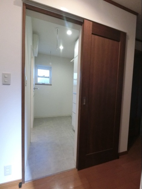 洗面室を広げても、広さは十分ある廊下。ただ開き扉だと場所は取ってしまうため、アウトセット引き戸を採用しています。