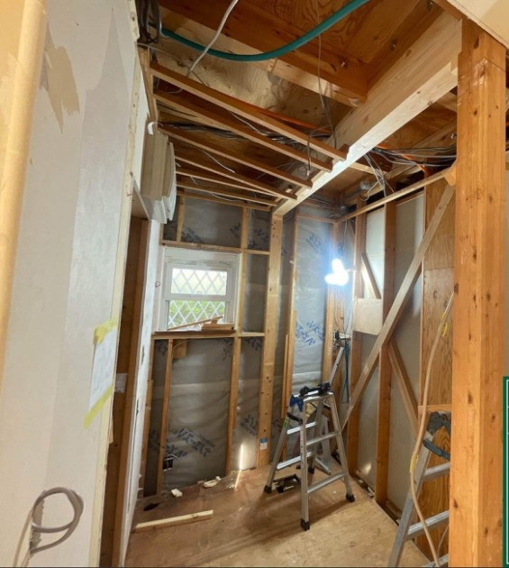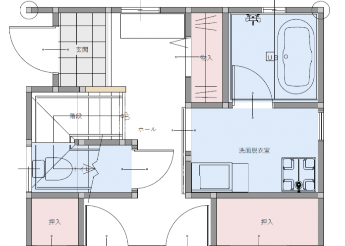 柱を移設し、かつ梁で補強をし、広々した洗面室を実現しました。