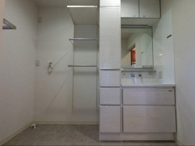 洗面室を広くしたことで、洗面台・収納・洗濯機を横並びに配置し、ライフスタイルに合った動線を作ることができました。朝の準備が洗面室で完結するよう、ハンガーパイプを設置したのもポイントの一つ。