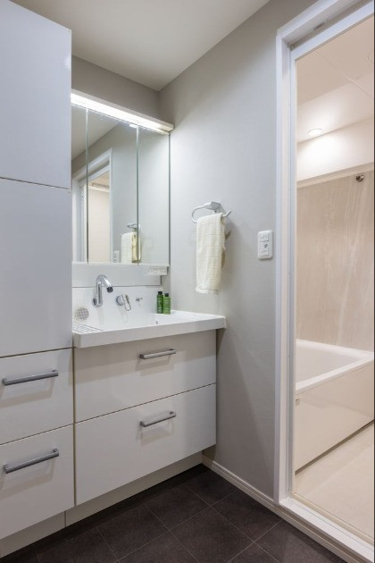 トールキャビネットも設置されているため、収納力が高く、洗面空間はいつもスッキリと整っています。