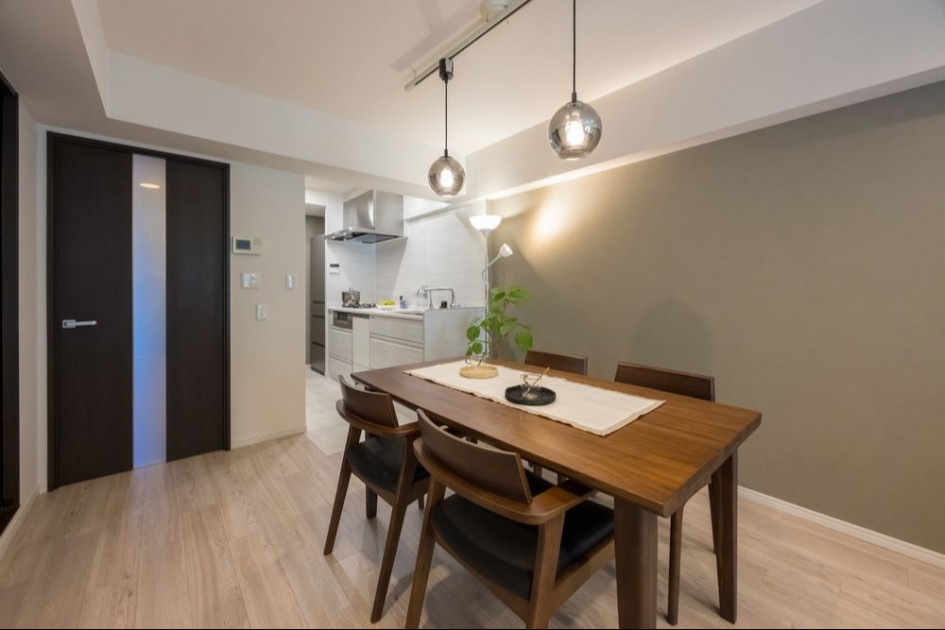 リビングダイニングにグレーのアクセントクロスを貼り落ち着きと上品さを演出。キッチンとつながりグリーンが映える広々空間。