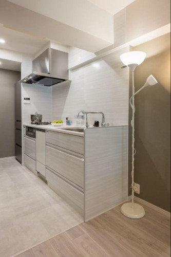 キッチンはホワイト系でまとめ、開放的な空間へ。パントリーに貼ったグレーのアクセントクロスが空間を引き締めます。