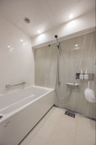 ジオマーブルアイボリーのホーロークリーン浴室パネルと、カームホワイトのキープクリーンフロアで高級感のある浴室空間が広がります。