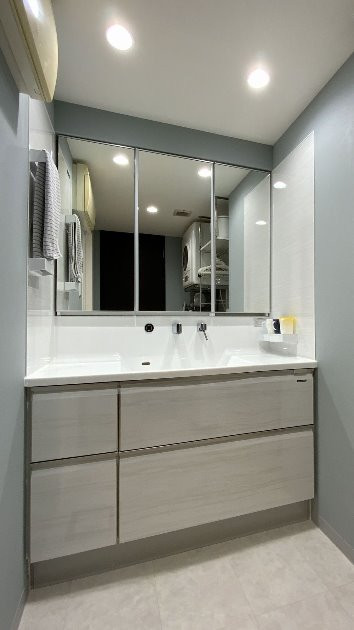 洗面はエリーナへリフォーム。大容量のホーローキャビネットは収納内部もホーローなのが奥さまお気に入りのポイントです。ローズウッドホワイトの扉とブルーグレーのクロスがおしゃれで清潔感のある洗面空間を演出。