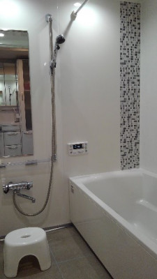 お掃除好きな奥様がお選びになったのは、タカラスタンダードのシステムバス。浴室パネルは高品位ホーローで汚れが染み込まず、床は磁器タイルでできたキープクリーンフロア。水滴が薄く広がるので乾きが早く、お掃除も楽に。清掃性の高い所が決め手になったようです。