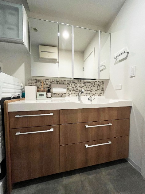 スタイリッシュな洗面空間。シックなグレーのフロアタイルを施工して空間がキリっと引き締まりました。
