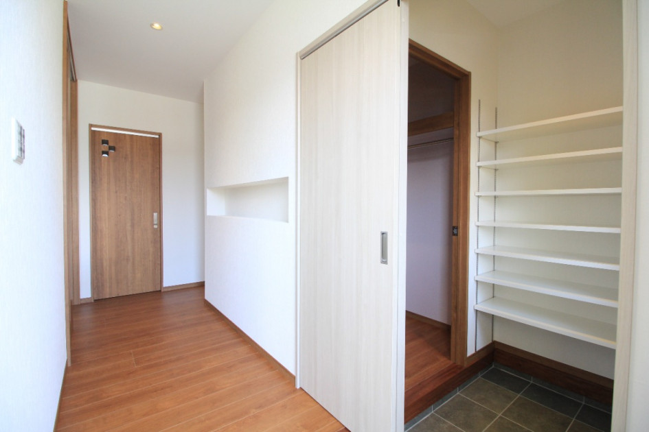 玄関にはシューズクローゼット・ウォークインクローゼットを設けました。 来客時には扉を閉じて隠せます。