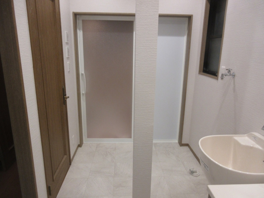洗面脱衣室とユーティリティーが間仕切壁で2部屋になっていたのですが、施主さまの希望で壁を壊して