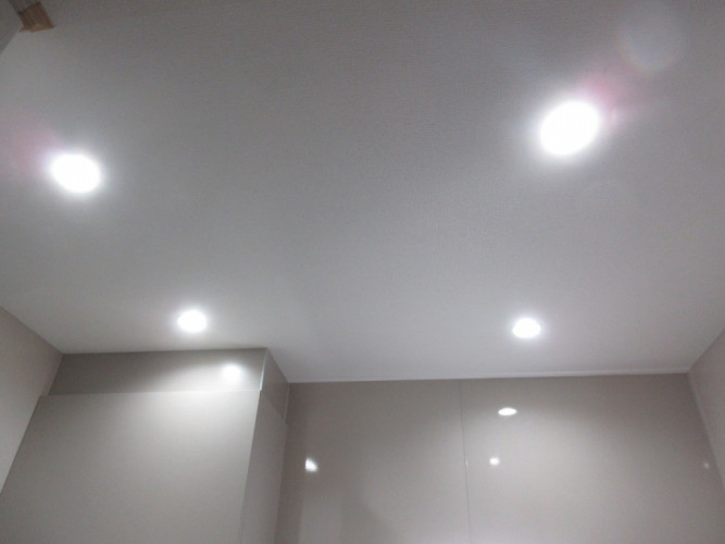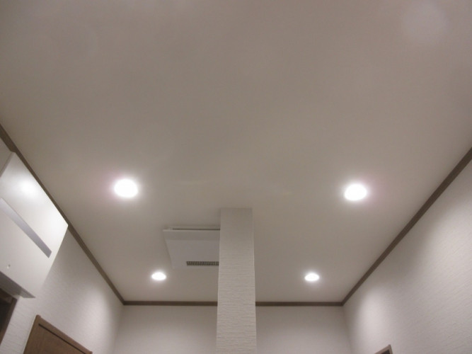 1部屋になりました。取り外せない柱があったのですが、それでも十分広くてキレイな洗面脱衣室になりました。洗面脱衣室の照明器具はすべてダウンライトに変更し、天井埋込の暖房乾燥機も取り付け